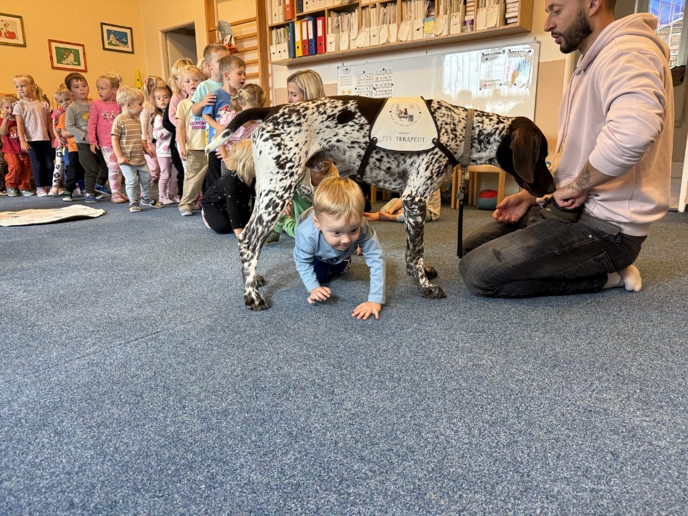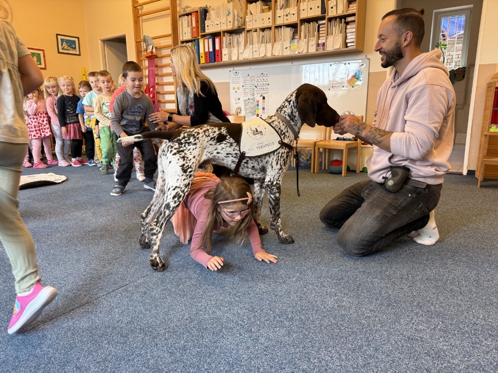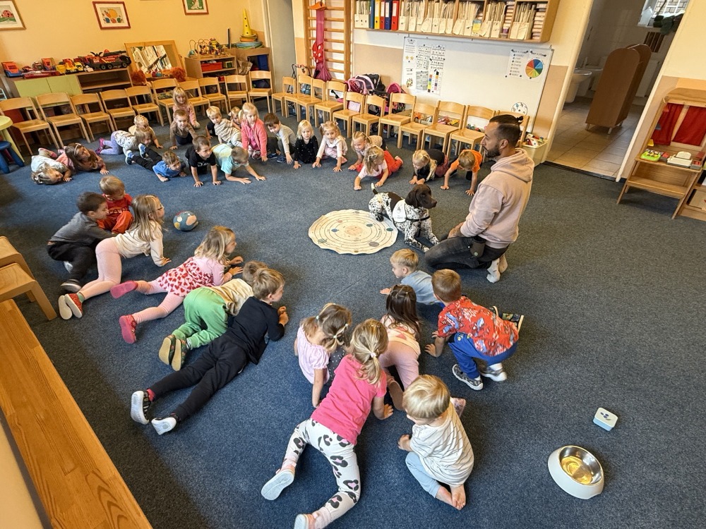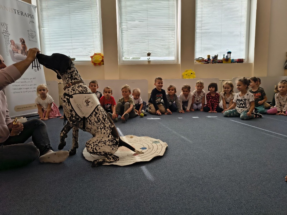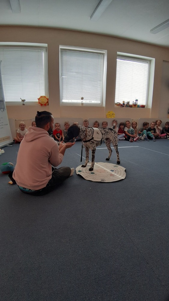 Do mateřské školy opět zavítal pan Ing. Filip Suk se svým pejskem Vesmírem. Děti se prostřednictvím canisterapie dozvěděly, jak se správně chovat ke psům a jak o ně pečovat. Měly možnost si s pejskem zacvičit, vyzkoušet si různé aktivity a společně si zahrát oblíbenou hru ,, Na zlatou bránu´´. Celé dopoledne probíhalo ve velmi příjemné atmosféře. Děti byly nadšené, získaly nové zkušenosti a zároveň zažily spoustu legrace a radosti. Panu Sukovi i pejskovi Vesmírovi moc děkujeme za krásné setkání a těšíme se na další návštěvu.
